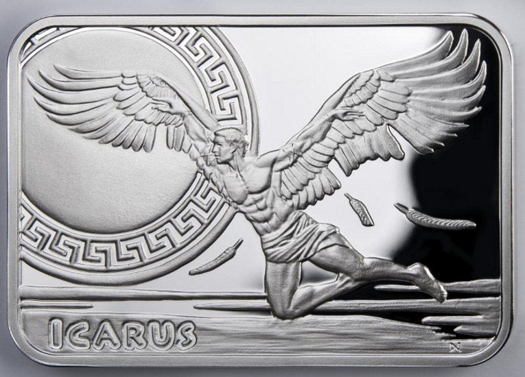 The first coin of the series depicts Icarus, the mythological forerunner of aviation whose will